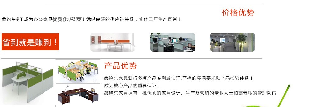 深圳市鑫銘東家具有限公司深圳市鑫銘東家具有限公司專業(yè)銷(xiāo)售各類辦公家具!產(chǎn)品涉及多種系列,如:班臺(tái)、班椅、屏風(fēng)、會(huì)議桌、會(huì)議椅、辦公沙發(fā)、茶幾、辦公桌、文件柜、電腦桌椅、各式餐臺(tái)、餐椅、書(shū)柜等辦公家具。 鑫銘東家具擁有一批優(yōu)秀的家具設(shè)計(jì)、生產(chǎn)及營(yíng)銷(xiāo)的專業(yè)人士和高素質(zhì)的管理隊(duì)伍。銘東家具以"先難后易"之戰(zhàn)略,在產(chǎn)品結(jié)構(gòu)、產(chǎn)品質(zhì)量及服務(wù)水平方面,均推陳出新,力求完善,精益求精。使我們的產(chǎn)品質(zhì)量保持在國(guó)內(nèi)外家具潮流的先進(jìn)水平,力求滿足客戶的特殊需求。鑫銘東家具多年來(lái)致力于環(huán)保、實(shí)用家具的設(shè)計(jì)與開(kāi)發(fā),集生產(chǎn)、銷(xiāo)售、服務(wù)于一體。本著"以人為本"的設(shè)計(jì)理念,大量開(kāi)發(fā)符合人體工程學(xué)的各種產(chǎn)品,以"誠(chéng)信為本"的質(zhì)量方針,真材實(shí)料,認(rèn)認(rèn)真真做產(chǎn)品,實(shí)實(shí)在在做人。鑫銘東家具更致力于創(chuàng)造"零維修率"的制造境界,實(shí)現(xiàn)"沒(méi)有維修的服務(wù)才是最好服務(wù)"的口號(hào)》了解更多 |